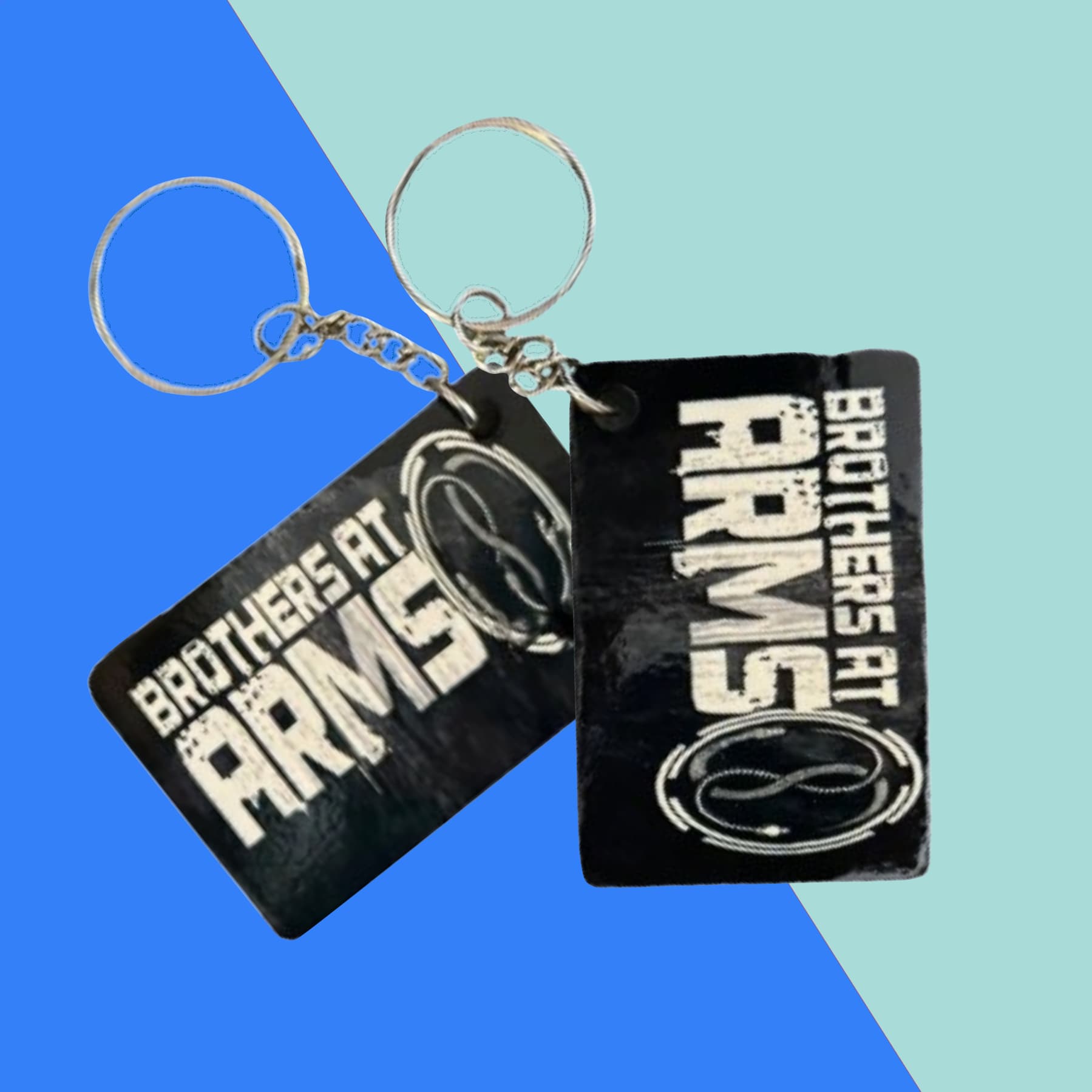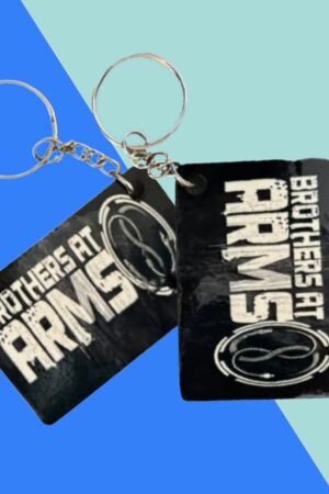 These measure approximately 1 1/2” X 2” They each come with a small chain and of course the key ring!